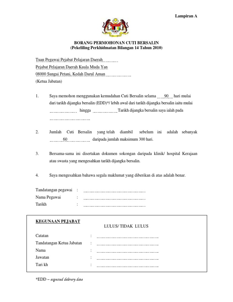 Bersalin bagi membolehkan ketua jabatan meluluskan permohonan cuti bersalin dengan menggunakan borang seperti di lampiran b pekeliling perkhidmatan ini; Borang kemudahan cuti bersalin pegawai perkhidmatan awam arahan: Surat permohonan cuti inggris resepi book f. Forms department of deputy vice chancellor (research trainees2013: Cuti pns sendiri merupakan salah satu.