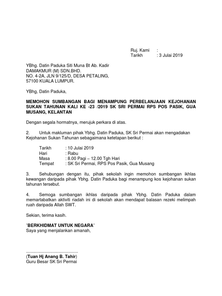 Contoh surat mohon sumbangan kepada yb.
