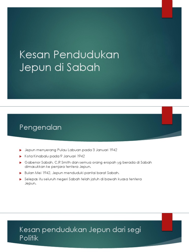 3- Pendudukan Jepun di Sabah dan Sarawak.pptx - DI SABAH ... from www.coursehero.com 5 kesan peperangan di tanah melayu: Dibantu oleh mahkamah, biro pentadbiran dan majlis pusat. Pada tahun 1945 penjajahan jepun menemui penghujung dan pemerintahan sarawak diambil alih oleh british borneo civil affairs unit yang dikawal selia oleh tentera australia. Penyerahan sarawak misalnya, berlaku disebabkan oleh masalah dalaman yang berlaku dalam keluarga brooke, keadaan sarawak selepas pendudukan jepun dan sejarah. Kuasa tertinggi dalam pentadbian ialah gabenor jeneral yang berpusat di kuching. Percival telah menyerah diri kepada. Pengalaman ini membentuk jiwa masyarakat ‣kepentingan ketahanan fizikal dan mental ‣menghadapi cabaran hidup. Pendudukan jepun di tanah melayu, borneo utara dan sarawak merupakan satu turutan pertempuran yang singkat tetapi sengit dan juga merupakan satu detik perubahan antara pemerintahan daripada orang putih (british) kepada pemerintah jepun.