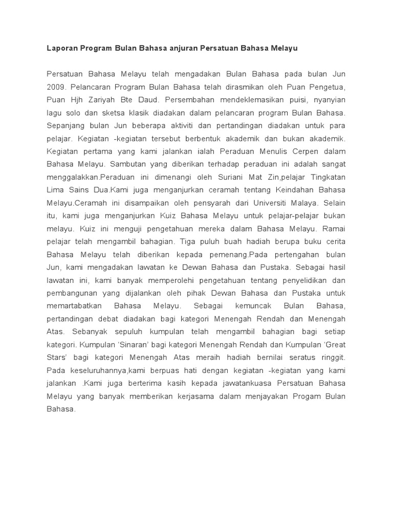Pada minggu pertama dan ketiga hanya dipaparkan kosa kata (makna dan contoh ayat), manakala pada minggu ketiga dan keempat dipaparkan peribahasa. 1 laporan ulbs bahasa melayu 2008. Bagaimana kamu mengucapkan dalam bahasa prancis? Pertandingan menulis esei dan cerpen, pertandingan bahas ala parlimen, deklamasi puisi, dan pementasan drama komsas antara aktiviti yang dijalankan sempena minggu bahasa di sekolah anda. Laporan minggu bahasa melayu sekolah kebangsaan bersatu.