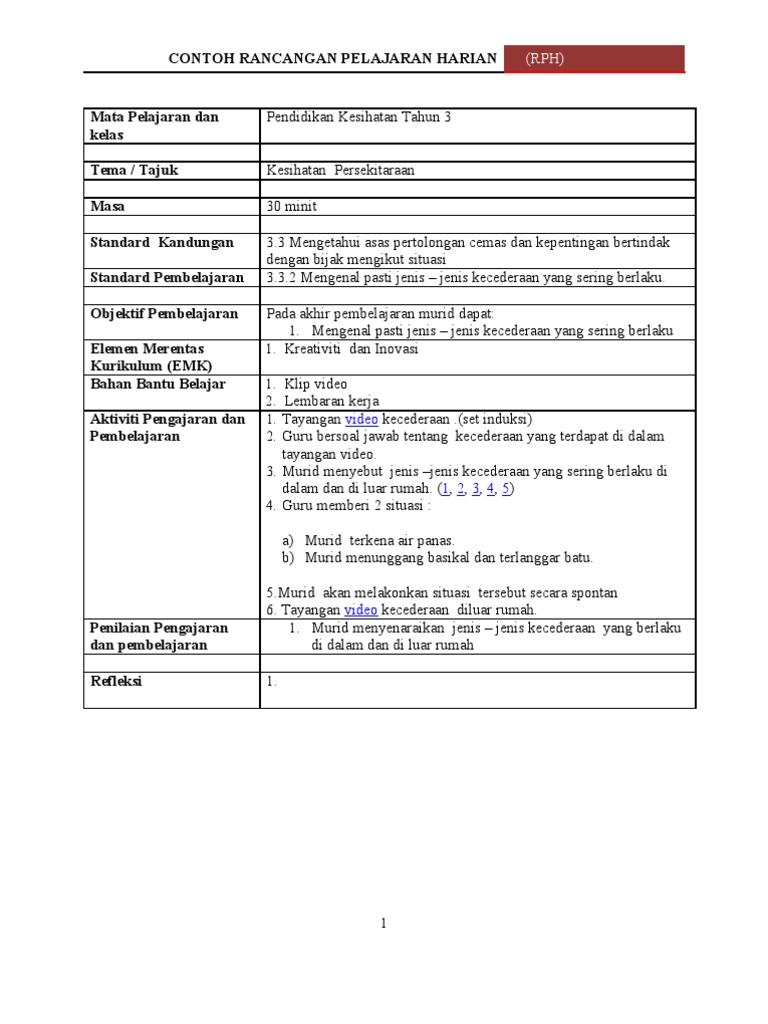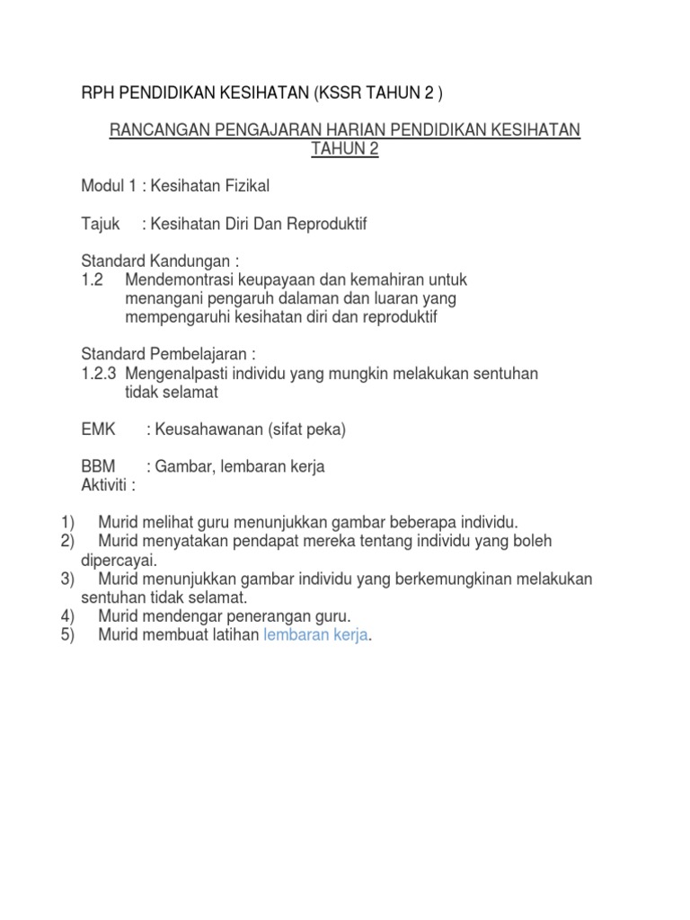 Rph pendidikan kesihatan tahun 3 adalah rancangan pengajaran harian yang perlu disediakan lebih awal oleh guru sebelum menjalankan sesi pegajaran dan pembelajaran. Rancangan pengajaran harian (rph) adalah asas pdpc. Justeru, panduan pengajaran pendidikan kesihatan tahun tiga ini dibina untuk membantu guru menterjemah kandungan dokumen standard pendidikan kesihatan tahun tiga serta melaksanakan proses. Rph pendidikan kesihatan tahun 3 kssr. Erph pendidikan jasmani kssr sekolah rendah;
